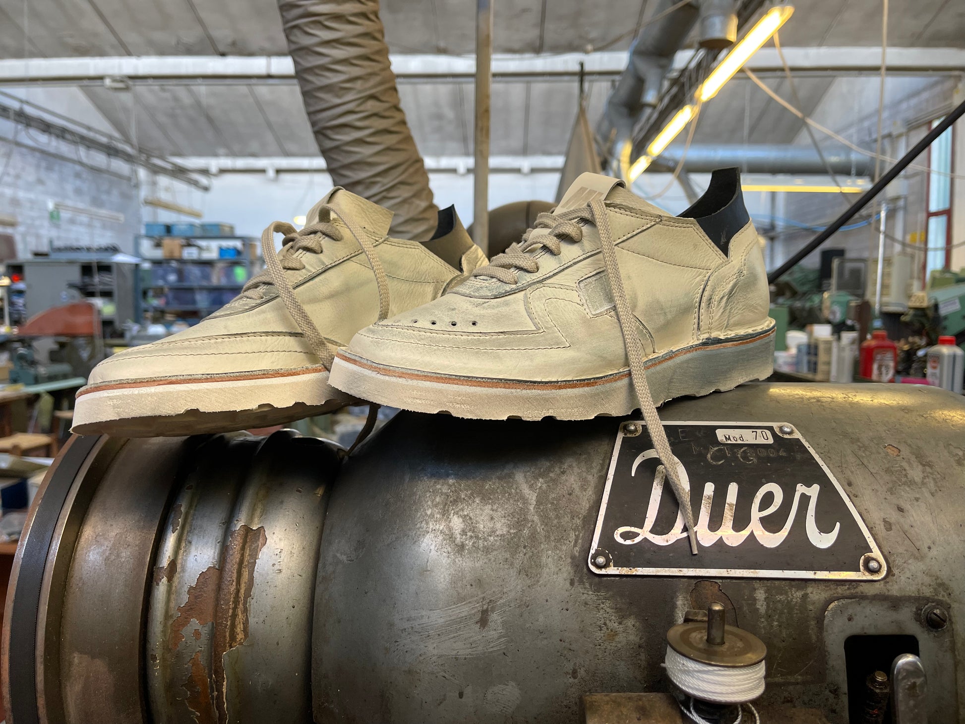 Sneaker cucita con lavorazione Ideal, tomaia in vitello colore off-white tagliata a mano, intersuola in cuoio, battistrada in gomma ultra light.